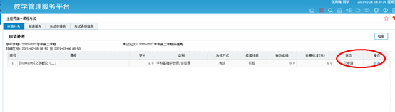 (2)在主控页面,点击“考试安排”,打开申请补考页面,符合补缓考条件的课程默认状态为“已申请”,在课程列表右侧点“取消”,即取消该门课程的补考申请。点“申请”,即申请该门课程补考。如下图所示: