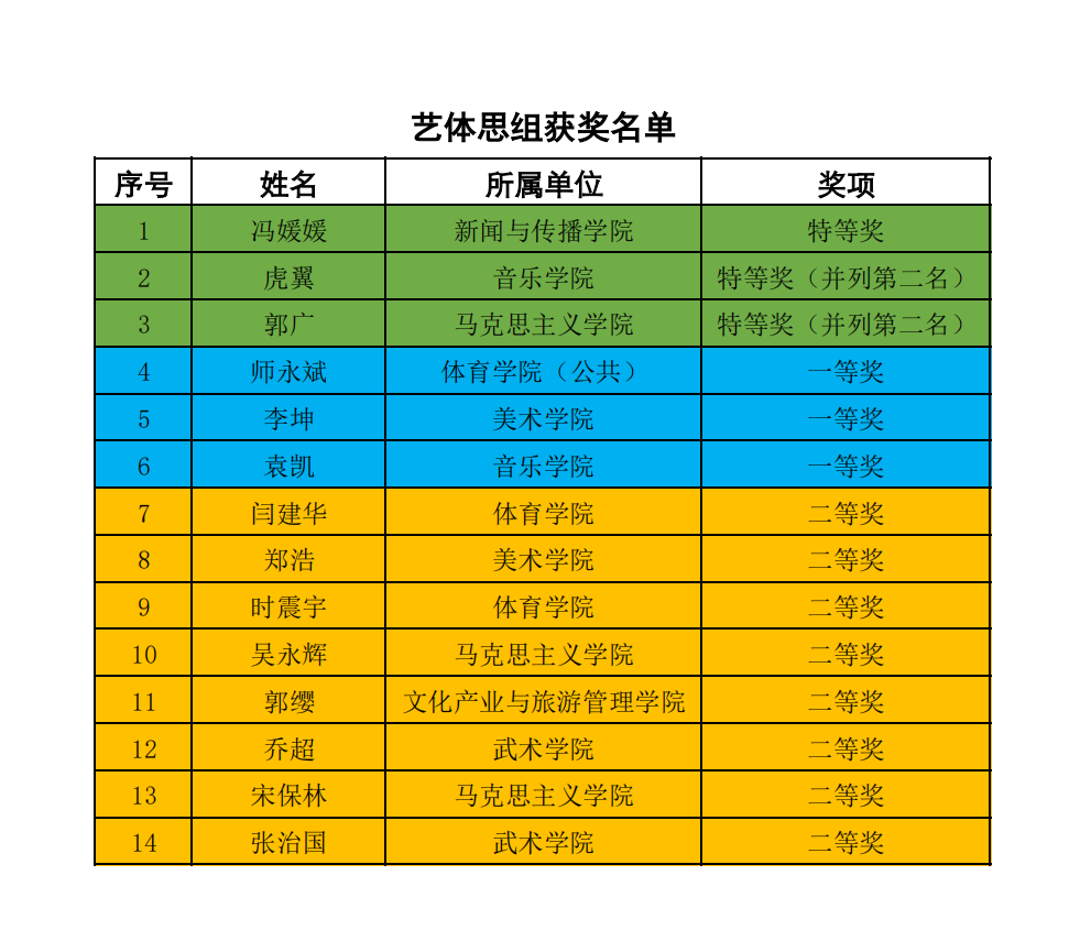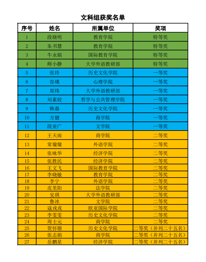 根据《关于开展河南大学2022年度教师教学技能竞赛活动的通知》相关安排,经各教学单位初赛推荐、学校对参赛选手资格审查,共有107名教师参加我校2022年度教师教学技能竞赛。现场比赛于2022年6月21-22日在金明校区举行。经过参赛教师的激烈角逐和评委专家的认真评审,最终有78位教师获奖,其中,特等奖12名、一等奖21名和二等奖45名。现将比赛结果予以公布。