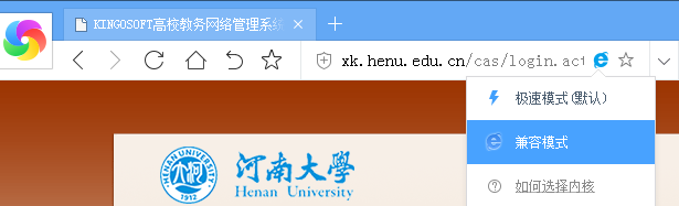 (2)360浏览器。打开教务管理登录页面后,将默认的“极速模式”改为“兼容模式”。如360浏览器无法正常使用,请使用IE浏览器。