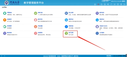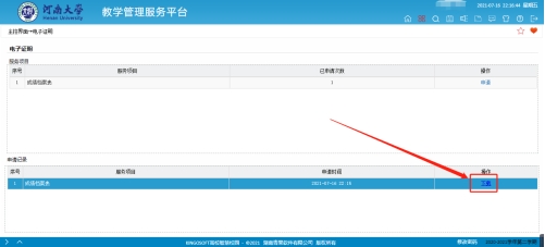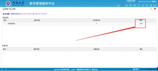 登录系统后,点击“电子证明”,并在开放时间内,选择成绩档案表后的“申请”按钮,如图2,图3所示: