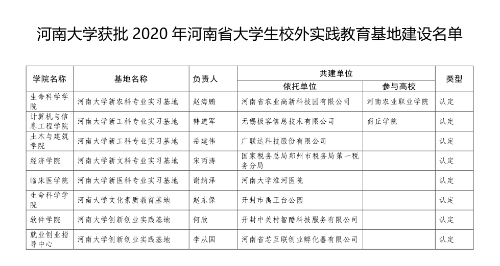 大学生校外实践教育基地是“高等学校本科教学质量与教学改革工程”的重要组成部分,是一流专业“双万计划”建设的重要指标。根据河南省教育厅《关于开展河南省本科高校大学生校外实践教育基地建设工作的通知》(教高〔2020〕82 号)要求,申报的大学生校外实践基地如已达到建设条件,实践教学效果优良,由专家组直接予以认定;需要立项建设的校外实践基地由专家组遴选后采取“先立项建设,后评价认定”的方式进行。我校积极组织各有关单位参与河南省本科高校大学生校外实践教育基地申报,经省教育厅评审,我校生命科学学院、计算机与信息工程学院、经济学院等单位的8个校外实践教育基地被认定为河南省本科高校大学生校外实践教育基地,现将结果予以公示。