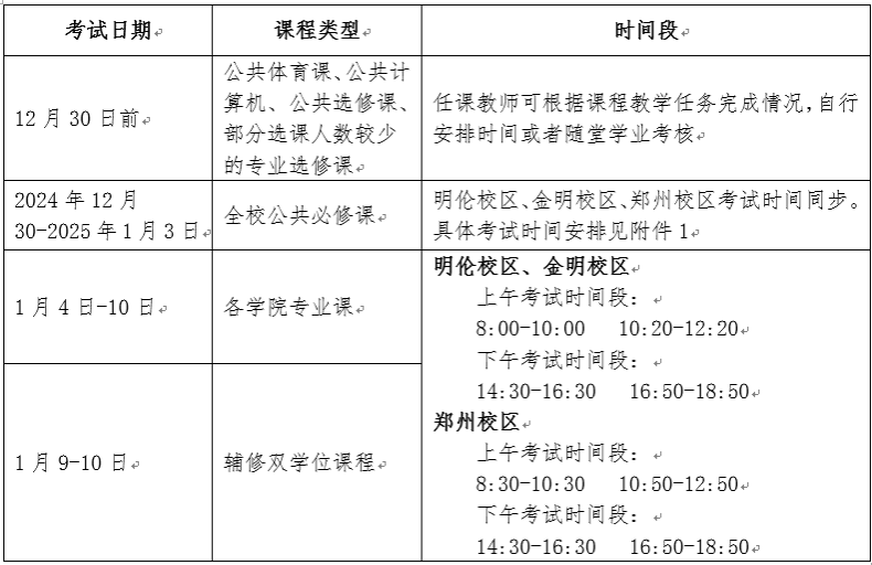 根据校历及本学期教学安排,2024-2025学年第一学期期末考试时间为2024年12月30日—2025年1月10日,为加强考试管理,严肃考风考纪,促进优良学风建设,保证期末考试各环节平稳有序进行,现将具体工作安排通知如下: