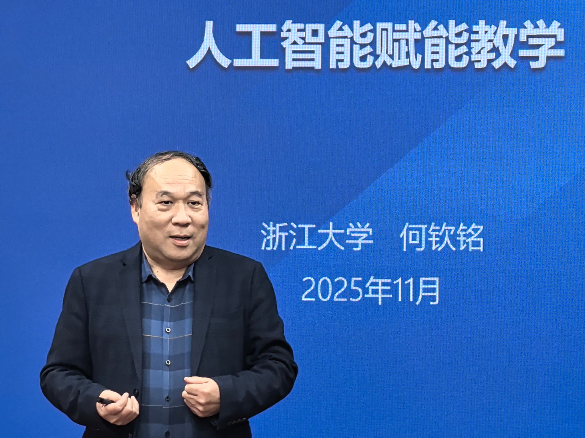 何钦铭教授以“人工智能赋能教学”为主题,系统梳理了国内外顶尖大学在人工智能通识教育及教学赋能方面的典型经验。报告聚焦人工智能在专业建设、课程设计与教育管理三大维度的应用,结合浙江大学实践,详细介绍了个性化程序设计训练、数字化督导等实践案例,生动展示了人工智能如何重塑教学内容、创新教学手段并优化管理流程。